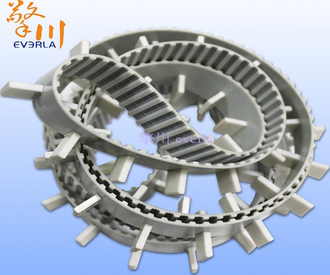 其獨(dú)特的擋板設(shè)計(jì)是一大創(chuàng)新亮點(diǎn)。擋板均勻且牢固地安裝在 PU 同步帶上,能夠有效地防止物料在輸送過(guò)程中發(fā)生位移或掉落。在物流分揀中心,包裹、貨物種類(lèi)繁多、形狀各異。PU 加擋板同步帶能夠?qū)⒏黝?lèi)貨物穩(wěn)定地固定在輸送帶上,即使在輸送帶轉(zhuǎn)彎、爬坡或加速減速過(guò)程中,貨物也能在擋板的阻擋下保持原位,順利完成分揀與輸送流程。這一設(shè)計(jì)極大地提高了物流輸送的可靠性,減少了貨物掉落造成的損失與輸送中斷的風(fēng)險(xiǎn),使得物流中心能夠?qū)崿F(xiàn)高效、連續(xù)的運(yùn)作。