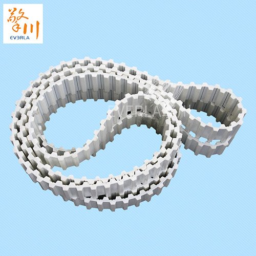 從材質(zhì)上看,橡膠材質(zhì)的雙面齒同步帶,以氯丁橡膠為基礎(chǔ),搭配高強(qiáng)度玻璃纖維線繩增強(qiáng)。這種材質(zhì)彈性良好,可吸收設(shè)備頻繁啟停產(chǎn)生的沖擊,降低運(yùn)行中的振動,適用于對穩(wěn)定性要求較高的倉儲設(shè)備。同時,它具備不錯的耐油、耐日光性能,在倉儲環(huán)境中能保持良好狀態(tài),抗拉伸與耐磨損能力也使其使用壽命得以延長。