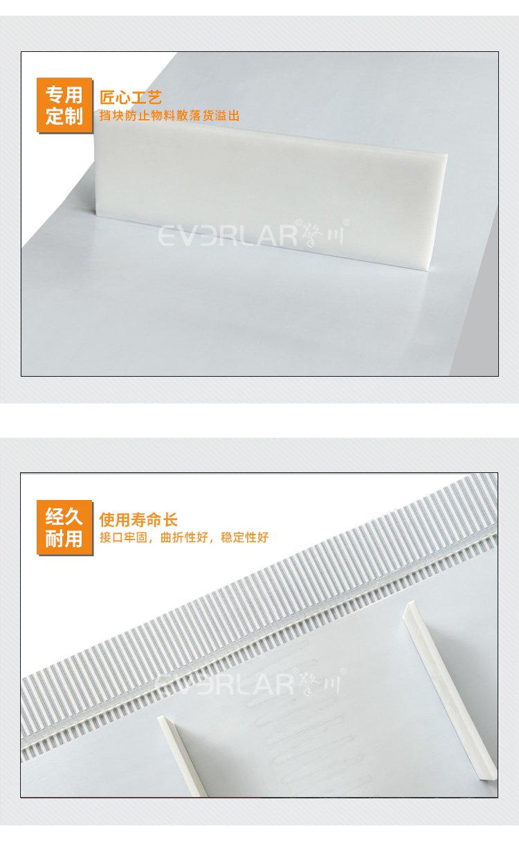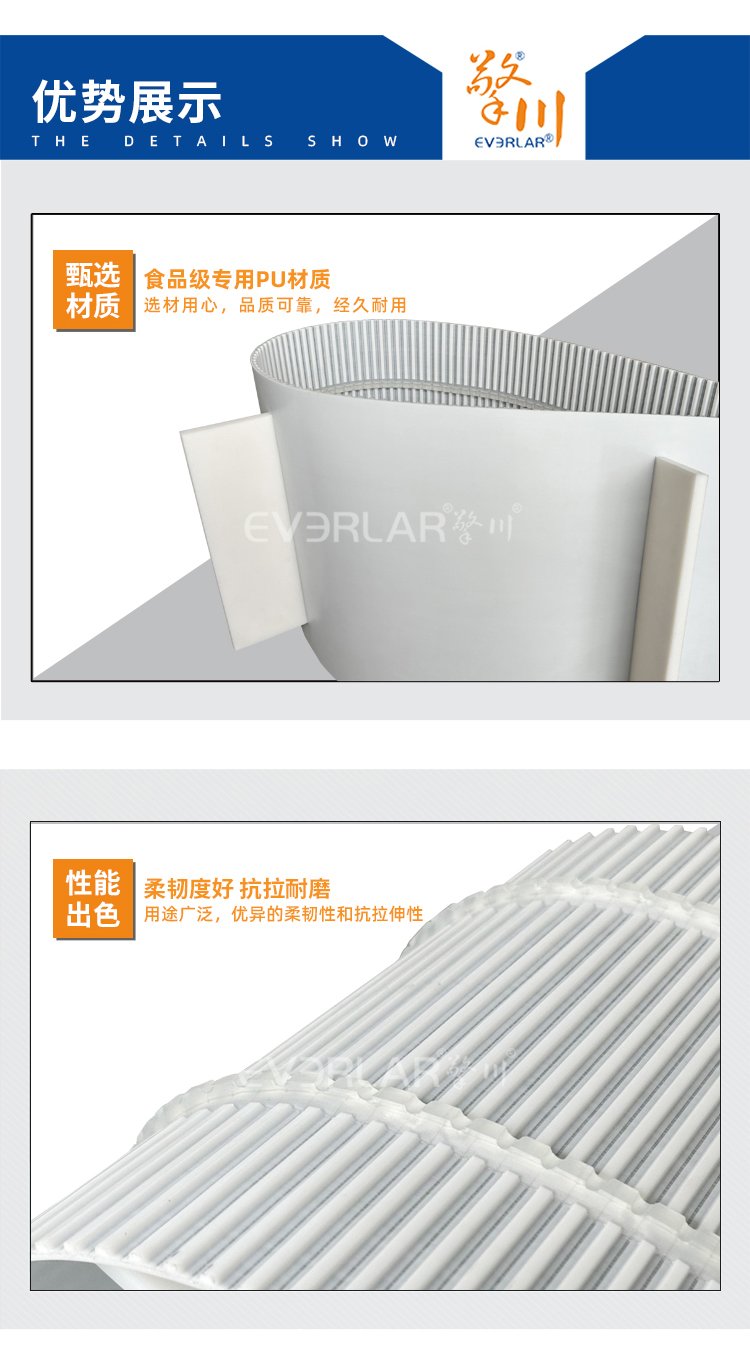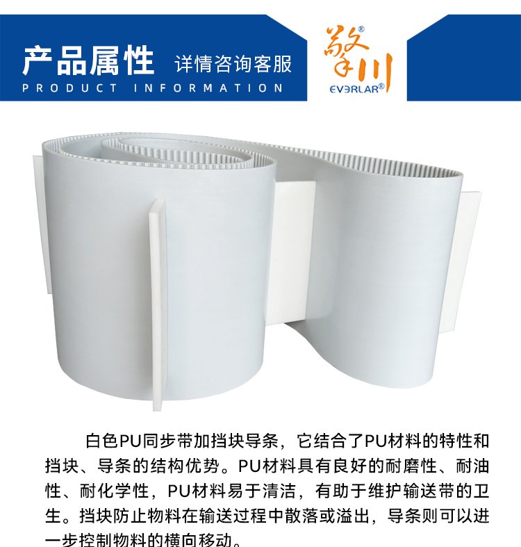 擎川EVERLA > pu同步帶 > 白色PU聚氨酯鋼絲同步帶加擋板導條耐磨耐油防溢出工業(yè)傳動帶定制